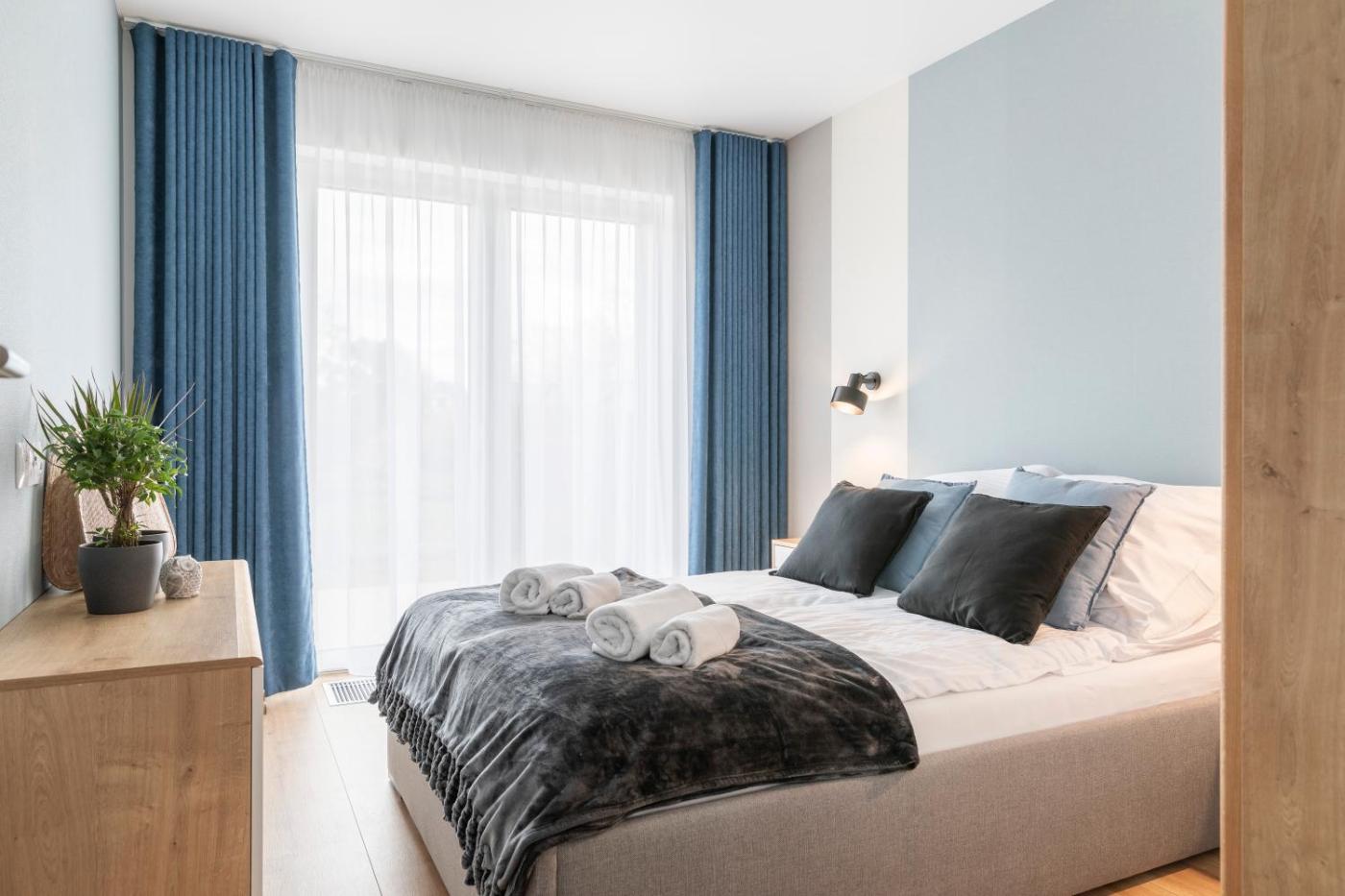Apartament z 2 sypialniami. Ten przestronny apartament z oddzielnym wejściem mieści salon, 2 oddzielne sypialnie oraz łazienkę z kabiną prysznicową. Udogodnienia obejmują doskonale wyposażoną kuchnię z płytą kuchenną, lodówką, zmywarką do naczyń i przyborami kuchennymi. Apartament ma dźwiękoszczelne ściany. Oferuje on telewizor z płaskim ekranem i dostępem do kanałów kablowych, pralkę oraz zestaw do parzenia kawy i herbaty. Z okien roztacza się widok na ogród. Do dyspozycji Gości są 3 łóżka. Apartament - 6 osobowy. Powierzchnia pokoju ok.: 64 mkw.