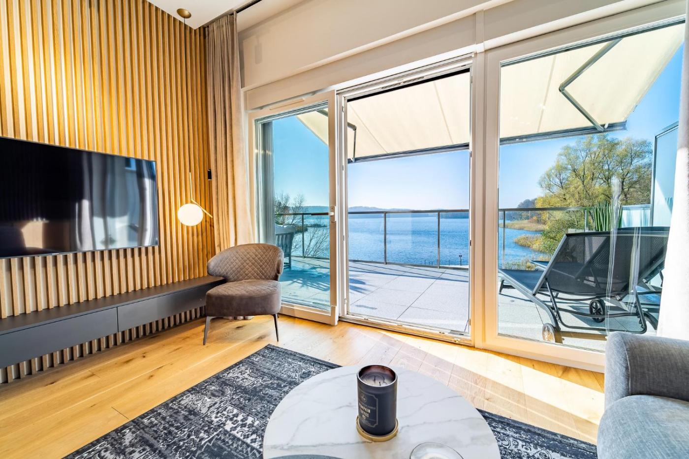 Apartament z 2 sypialniami. Meals can be prepared in the well-fitted kitchenette, which has a stovetop, a refrigerator, a dishwasher and kitchenware. The spacious air-conditioned apartment features a flat-screen TV with cable channels, a washing machine, a private entrance, a tea and coffee maker as well as lake views. The unit has 3 beds. Apartament - 6 osobowy. Powierzchnia pokoju ok.: 76 mkw.