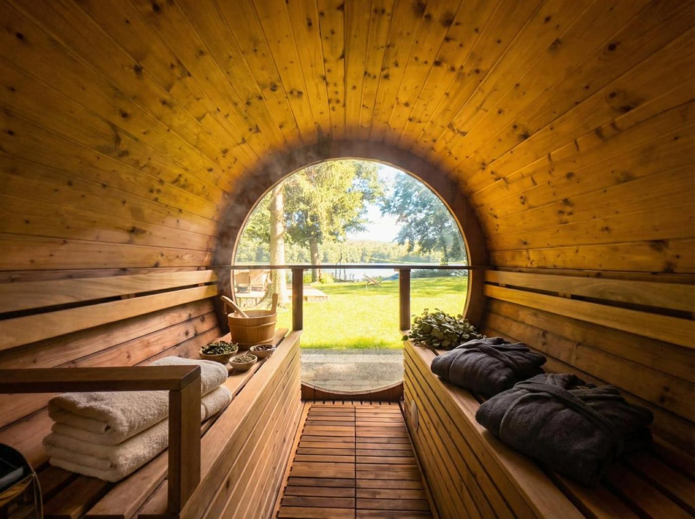Willa. The sauna and fireplace are the standout features of this villa. Boasting a private entrance, this air-conditioned villa comes with 1 living room, 3 separate bedrooms and 2 bathrooms with a shower and a hairdryer. Guests will find a stovetop, a refrigerator, a dishwasher and kitchenware in the well-fitted kitchen. The villa also includes a barbecue. Featuring a terrace with lake views, this villa also features a washing machine and a flat-screen TV with streaming services. The unit has 4 beds. Willa - 8 osobowy. Powierzchnia pokoju ok.: 120 mkw.